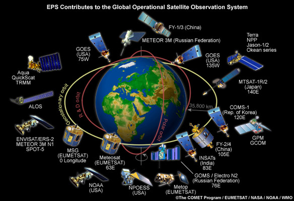 Les satellites font l’objet d’une coopération mondiale par échange de données afin d’avoir à tout instant une vision complète du globe terrestre.